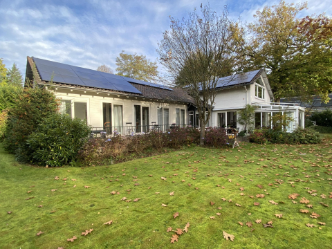 De eetkamer heeft niet alleen een open verbinding met de keuken, maar ook een schuifpui naar de zeer comfortabele serre. Deze serre met vloerverwarming en elektrisch zonnescherm is een echte toevoeging aan het woongenot: in koudere dagen is het een verlengstuk van de woonkamer en in de lente kunnen de schuifdeuren opengezet worden, zodat men gevoelsmatig al lekker buiten zit.